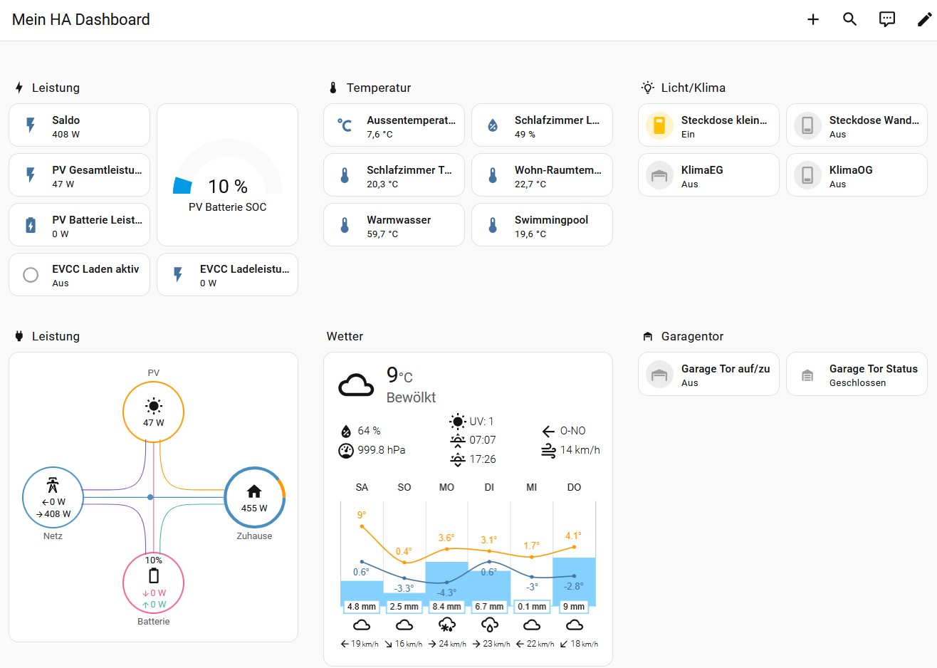 Auf einem Mini-PC (Intel N100, 16GB DDR5, 512GB SSD) wurde Proxmox installiert, in einer VM läuft Home Assistant OS, auf einem LXC läuft EVCC. Nach ein paar Stunden Konfiguration und Programmierung (PV Batterie: Übergabe der Lade-/Entladeleistung und SOC an HA; einige ESP wurden von ESPEasy auf ESPHome umgestellt) sind alle smarten Geräte im HA: Amis Lesekopf, Fronius Wechselrichter, AhoyDtu, PV Batterie, Pelletsheizung, Shellys, ein paar smarte ESP Kontroller mit ESPHome und die Ulanzi/awtrix Pixel-Statusanzeige.