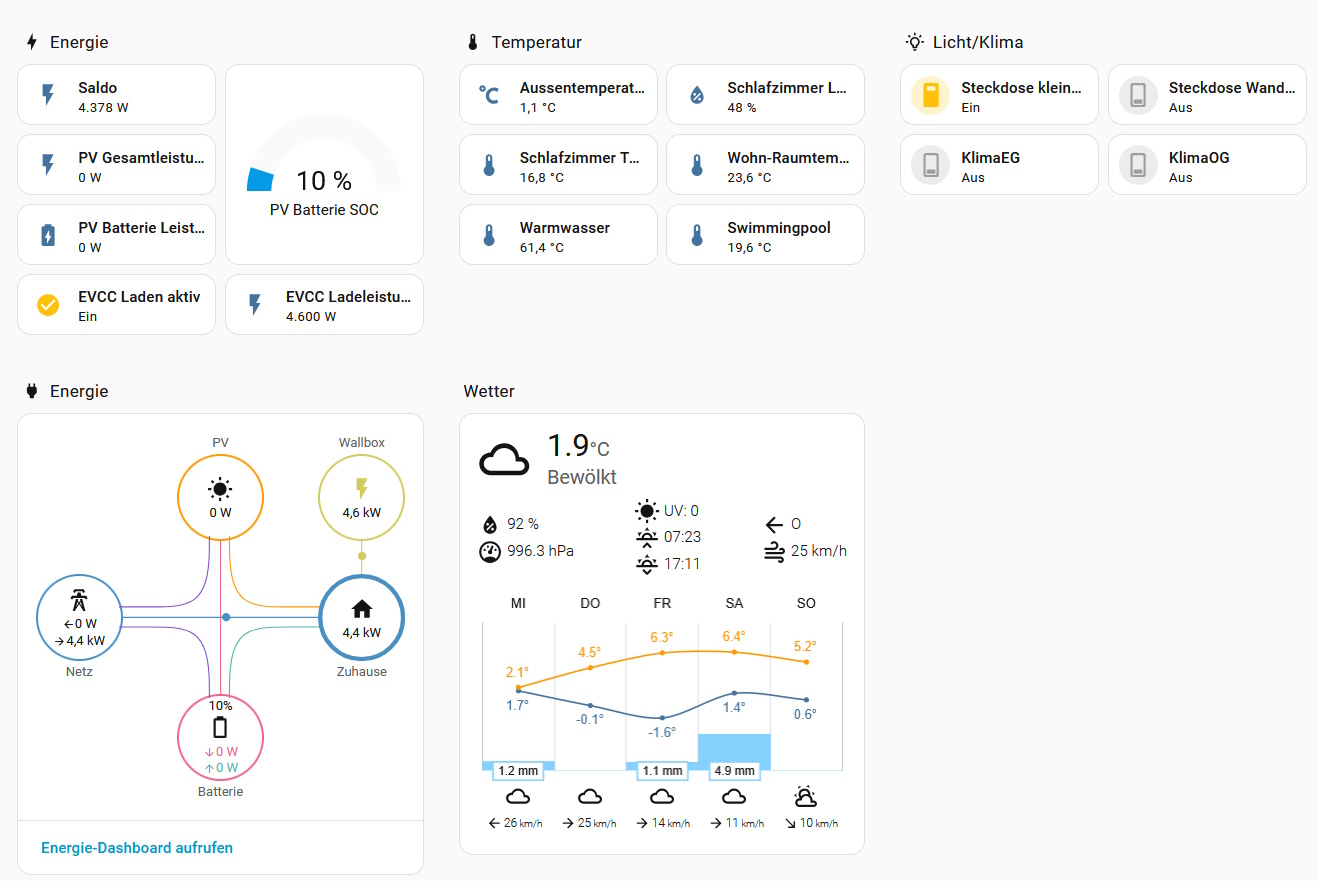 Auf einem Mini-PC (Intel N100, 16GB DDR5, 512GB SSD) wurde Proxmox installiert, in einer VM läuft Home Assistant OS, auf einem LXC läuft EVCC. Nach ein paar Stunden Konfiguration und Programmierung (PV Batterie: Übergabe der Lade-/Entladeleistung und SOC an HA; einige ESP wurden von ESPEasy auf ESPHome umgestellt) sind alle smarten Geräte im HA: Amis Lesekopf, Fronius Wechselrichter, AhoyDtu, PV Batterie, Pelletsheizung, Shellys, ein paar smarte ESP Kontroller mit ESPHome und die Ulanzi/awtrix Pixel-Statusanzeige.
